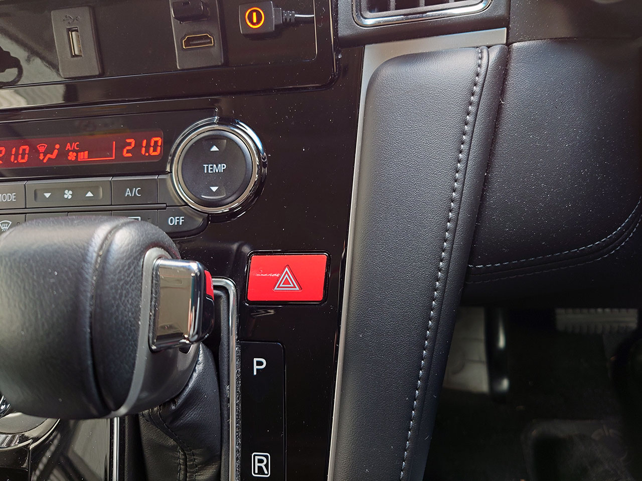 後期型のハザードスイッチはセンターコンソールのシフトゲートの右側についていて、三角マークは赤と白の多重ロゴとなっているが、スイッチ自体はコンソールと同じ光沢ピアノブラックで一体感を持たせるデザインのせいか、目に留まりにくい。